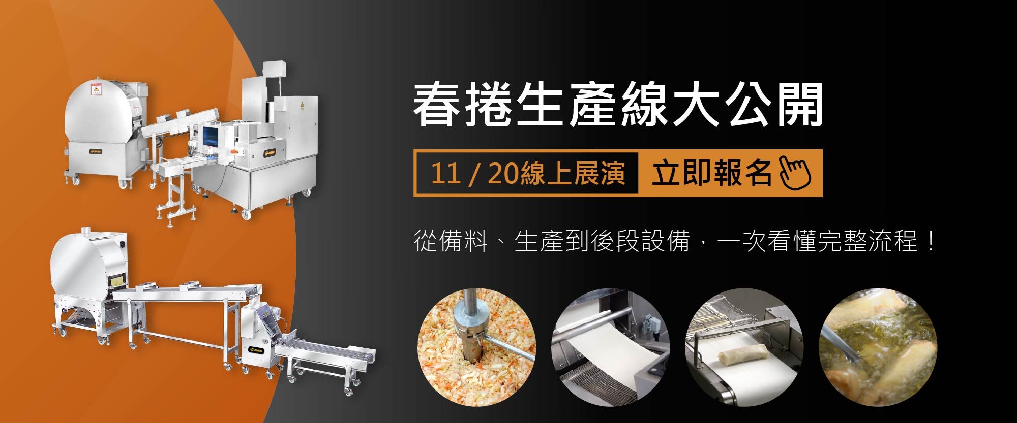 30 Oct, 2025这场直播将完整呈现「蔬菜春卷从备料、生产到后段设备的全套方案」,从生鲜蔬菜备料开始,到春卷包制成型、油炸、包装、检测的整体流程,让您一次了解如何打造高效率、自动化的春卷生产线。本次活动重点将聚焦于SR-27 春卷机,透过现场实机操作展示其高速稳定的生产表现与多样馅料适应能力,协助厂商掌握生产效能与品质兼具的最佳解决方案。