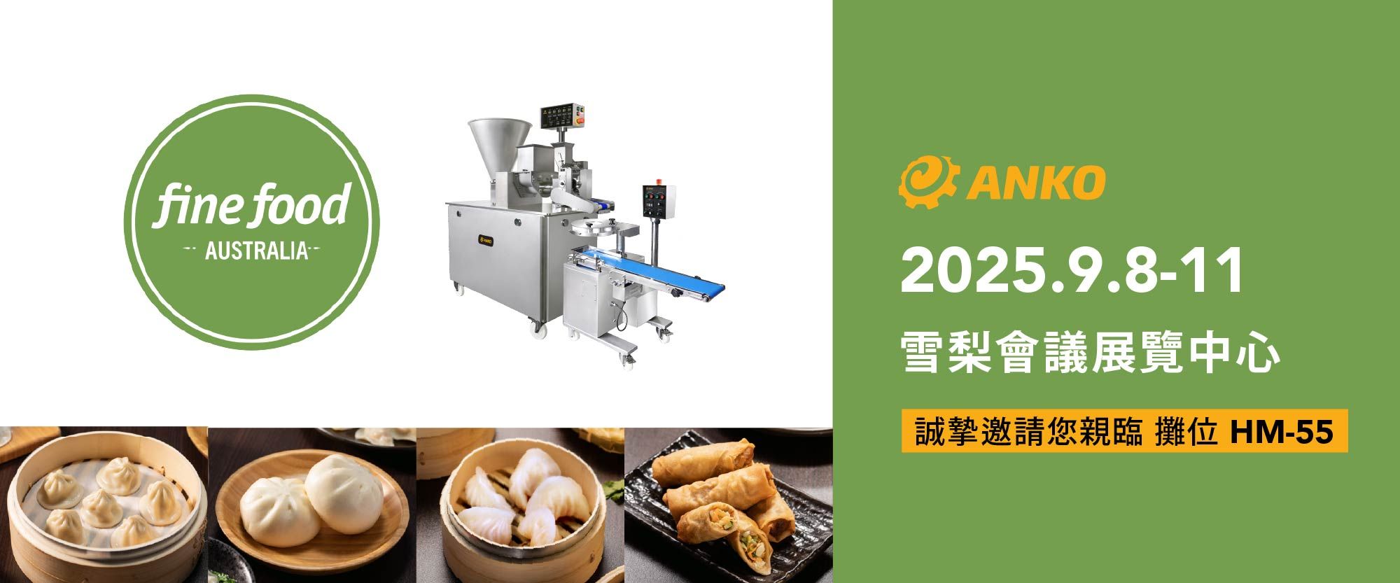安口將在 9/8 至 9/11 Fine Food Australia 展覽與您見面,現場實機展示水餃機與小籠包成型解決方案,針對冷凍食品、即食點心、自動化食品生產線等需求,提供專業諮詢與產線升級建議。此次參展,不僅展示機器,更是邀請正在尋求擴廠、升級、解決人力瓶頸的食品業者,一同深入了解產業自動化的趨勢與解方。